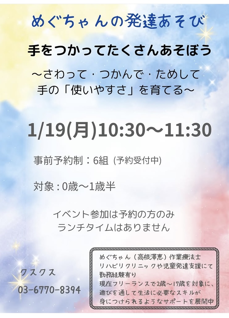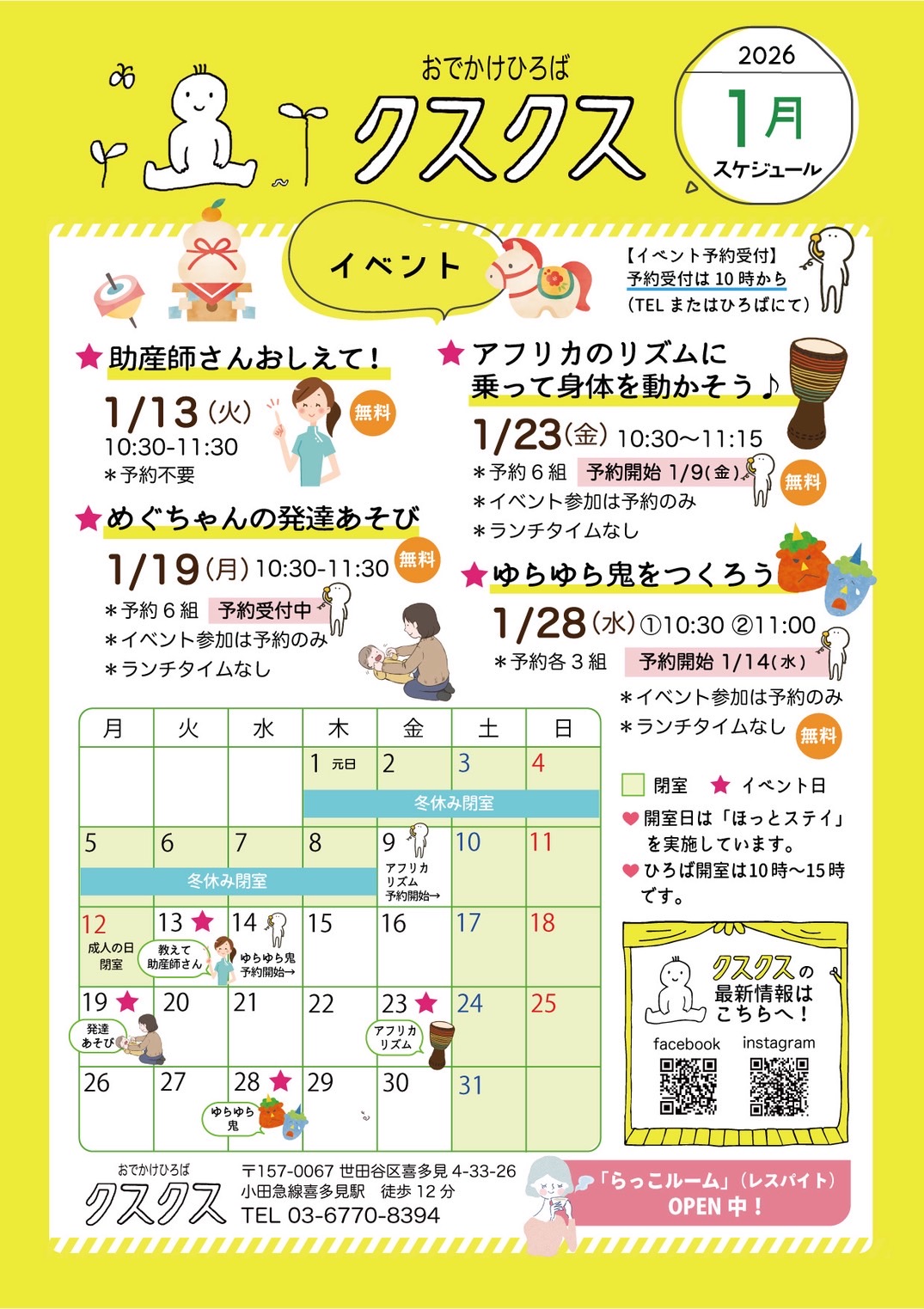 おでかけひろばクスクス 〒157-0067 世田谷区喜多見4-33-26 Tel:(03)6770-8394 kusukusuyokoito@gmail.com 喜多見駅より徒歩12分 開室:平日10時〜15時(土日祝日休 夏季冬季休業あり)